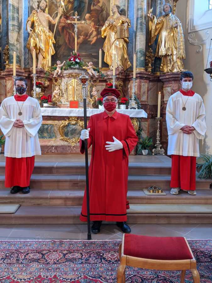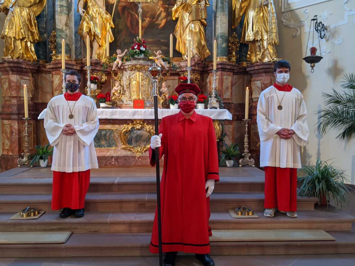 Inzwischen haben sich schon viele Gottesdienstteilnehmende daran gewöhnt, dass die Ordner und Ministrantendienste, dass Mesner und Lektoren*innen und die Kantoren*innen und nicht zuletzt der Zelebrant einen Mund-Nase-Schutz tragen, solange sie in Kontakt mit den Gottesdiensteilnehmenden sind. In St. Märgen haben sich die beiden Ministranten Robert Wehrle und Dominik Löffler zusammen mit den Kirchenvogt Thomas Hummel gerne für ein Foto aufgestellt. Christoph Löffler, u.a. Kantor in St. Märgen, hat in seiner Werkstatt eigens für den Kirchenvogt einen passenden roten Mund-Nase-Schutz gefertigt. Aus allem das Beste machen, lautet das Motto.
