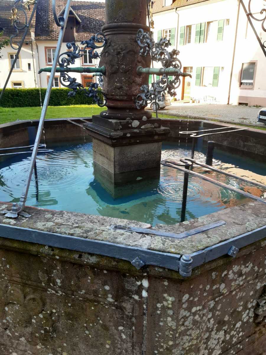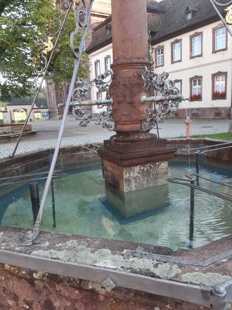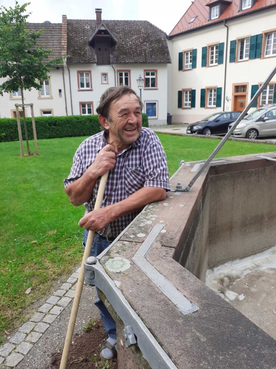 Schon seit dem Sommer ist der Breisacher Brunnen im Klosterhof in St. Peter wieder am Laufen. Markus Ketterer, Hausmeister im Geistlichen Zentrum, hat den Brunnenboden und den Brunnenrand wieder abgedichtet. Das Wasser floß in den Boden bzw. seitwärts ab und sammelte sich deshalb nicht mehr im Brunnen. Unterstützt wurde er vom Brunnenpaten, Pfr. i.R. Stefan Saum, der die Außenanlage wieder herausgeputzt hat.