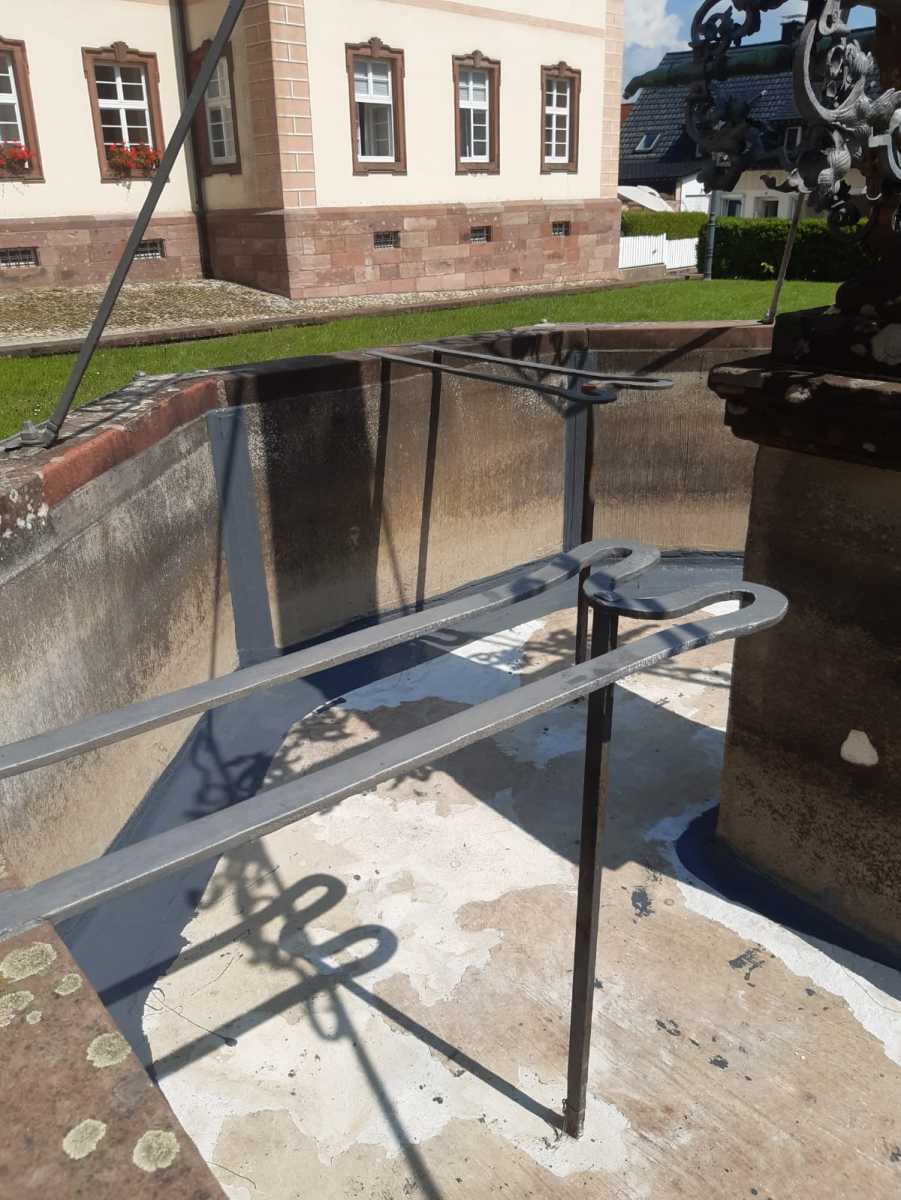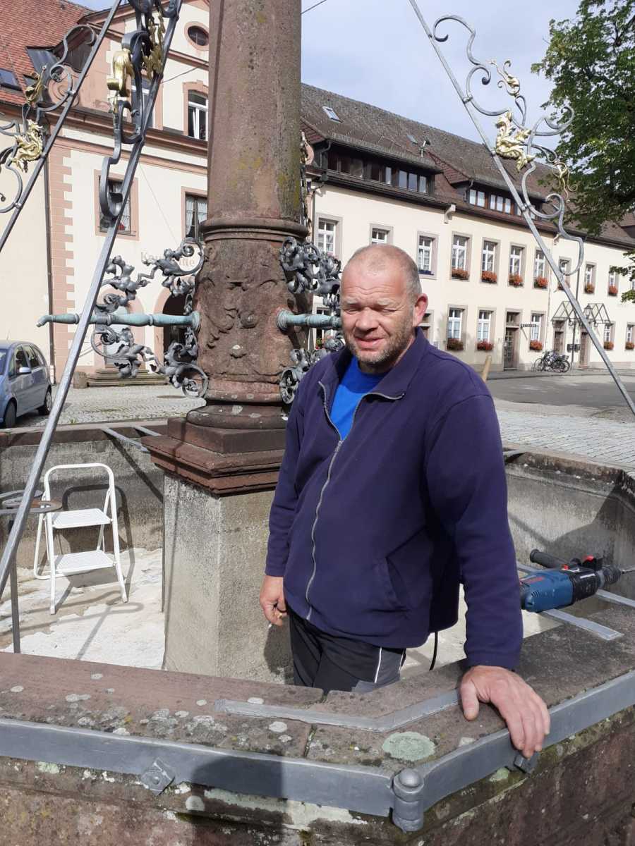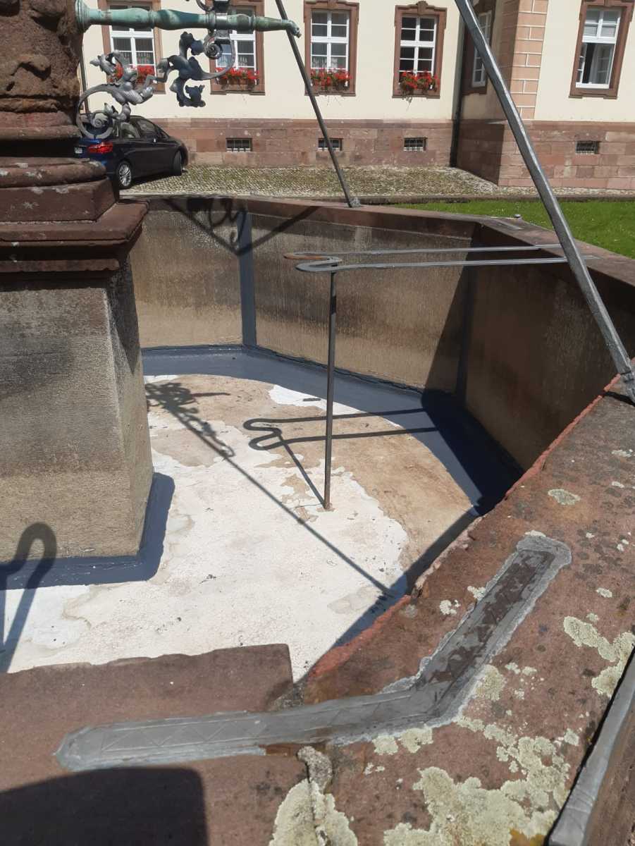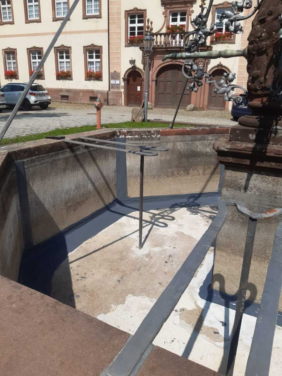 Schon seit dem Sommer ist der Breisacher Brunnen im Klosterhof in St. Peter wieder am Laufen. Markus Ketterer, Hausmeister im Geistlichen Zentrum, hat den Brunnenboden und den Brunnenrand wieder abgedichtet. Das Wasser floß in den Boden bzw. seitwärts ab und sammelte sich deshalb nicht mehr im Brunnen. Unterstützt wurde er vom Brunnenpaten, Pfr. i.R. Stefan Saum, der die Außenanlage wieder herausgeputzt hat.