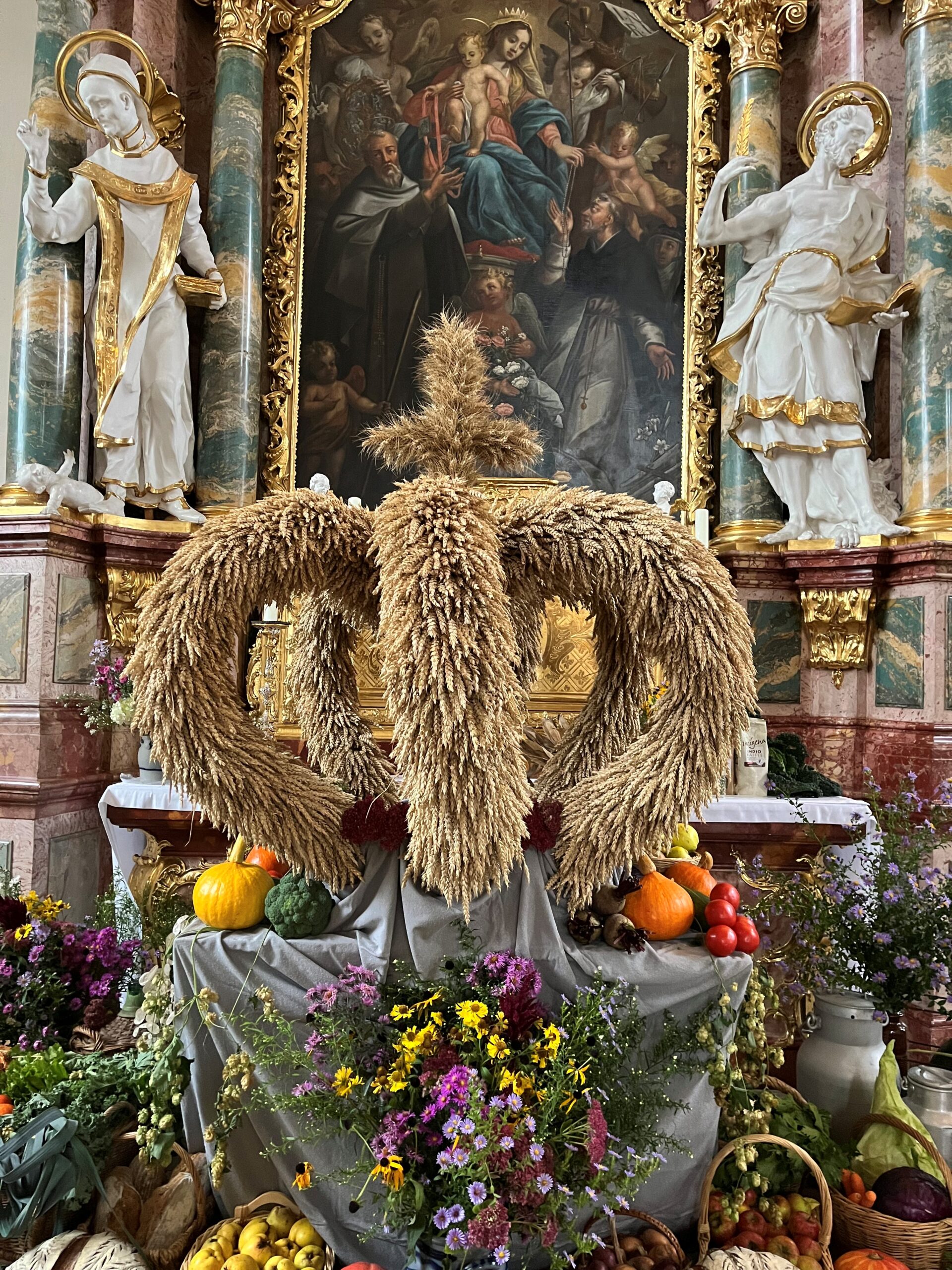 Eigentlich stimmt es nicht ganz, dass die Landfrauen in St. Peter ihren Erntealtar dieses Jahr neugestalteten. Mittelpunkt war die Erntekrone, die man früher schon so oder ähnlich in der Kirche aufgestellt hatte. Doch der Brauch war fast in Vergessenheit geraden. Wäre man nicht auf das Eisengestell auf einem Dachboden der Pfarrei gestoßen. Die Landfrauen St. Peter waren schnell begeistert. Geeignete Getreidehalme erntete man auf dem Muckenhof. Als die Erntekrone gebunden war, war man selbst von die Größe überrascht. Die kleine Fotoserie gibt einen guten Einblick.