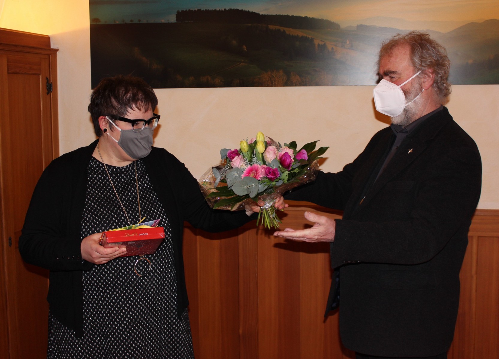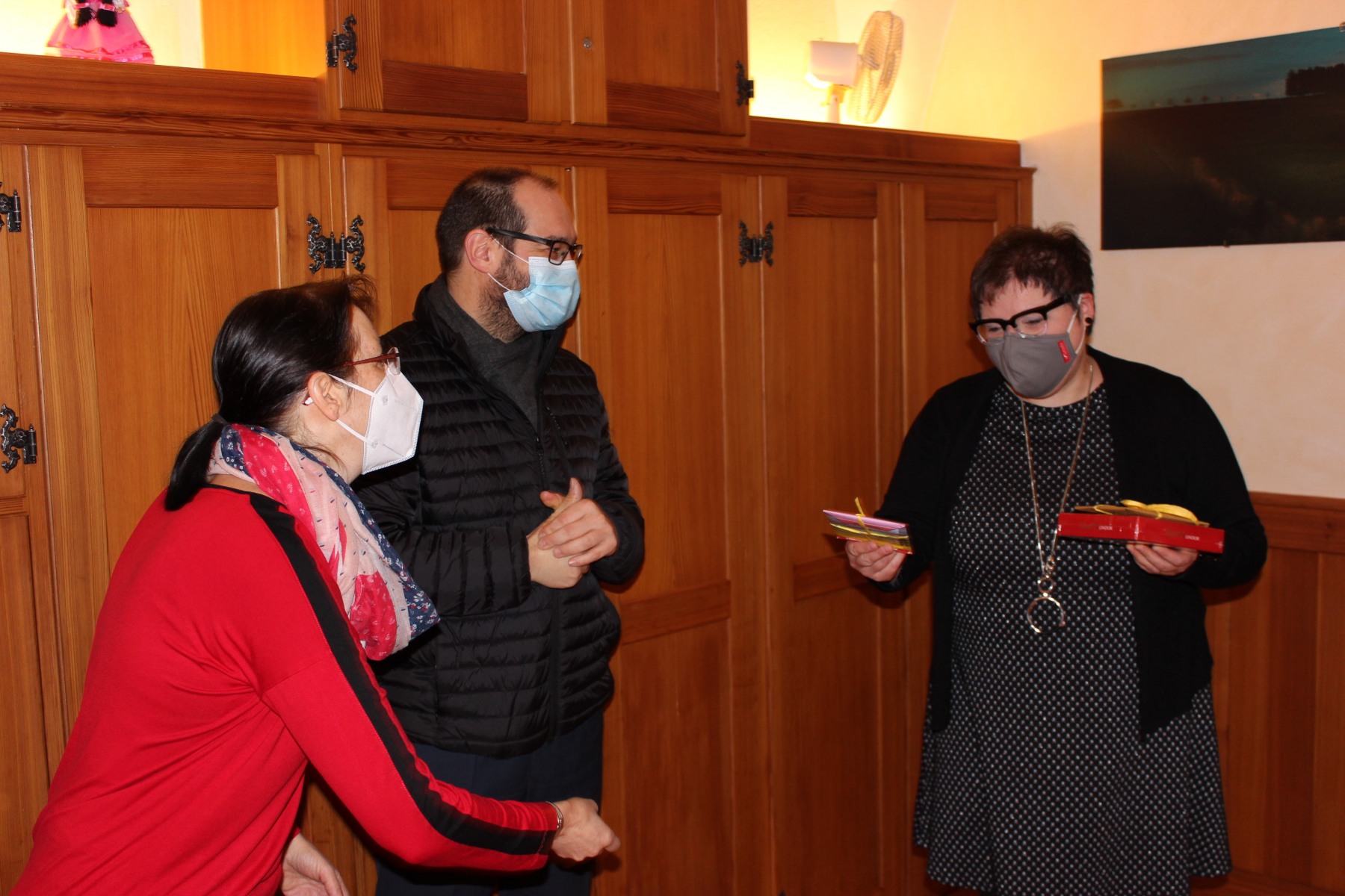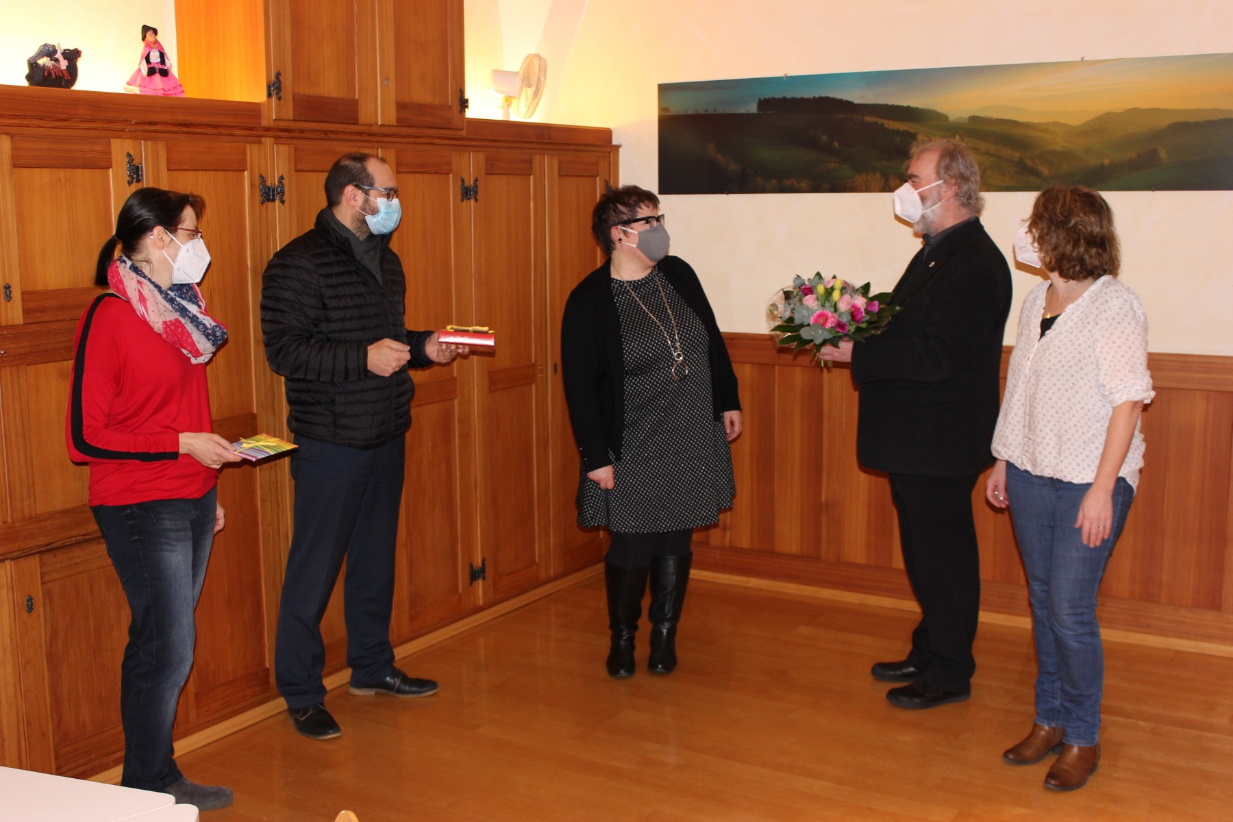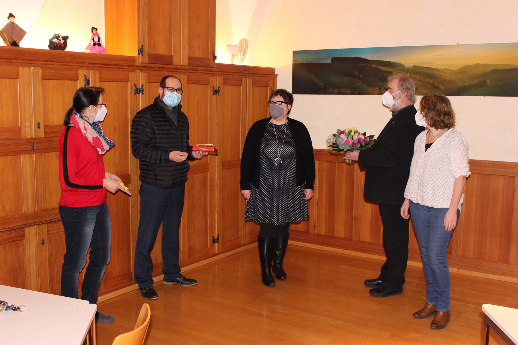 Eva Asal wollte keinen großen Abschied. Die Bilder zeigen die Verabschiedung in kleinem Rahmen mit dem Pfarrgemeinderatsvorsitzenden Frank Götz, den beiden Sekretärinnen Birgit Ferroni und Sylvia Hummel und mit Pfarrer Armbruster.